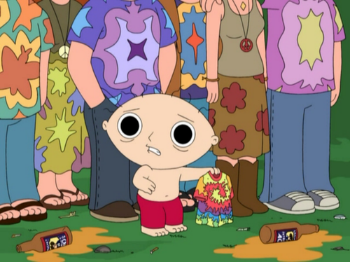 Criado por Seth McFarlane, “Uma Família da Pesada” é diretamente influenciado por “Os Simpsons”. A primeira temporada da série foi ao ar na TV norte-americana em 1999 e traz a família de Petter Griffin, um gordão pra lá de politicamente incorreto. Entre as peculiaridades da série, destaque para a dupla Brian e Stewie, cachorro e caçula da família, especificamente. Brian já usou todos os tipos de drogas e Stewie não fica atrás. Olha a foto da “bad trip” do bebê durante um show do Greatful Dead.
