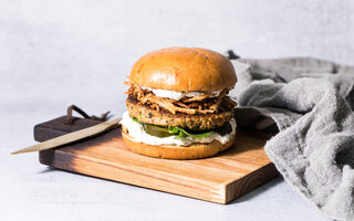 No restaurante Casaria, peça o Burger, preparado com brioche, hambúrguer, crispy de bacon, queijo coalho chapeado, chimichurri e batata chips. Custa R$46.