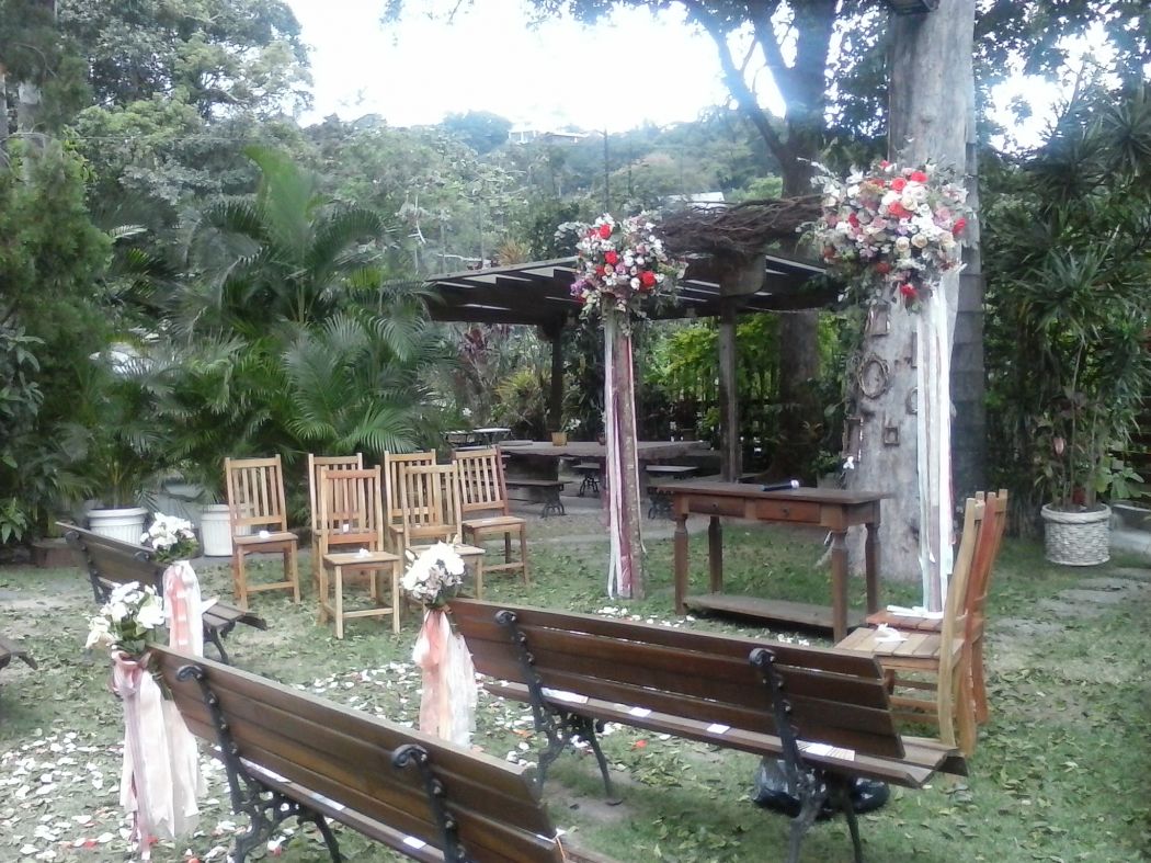 Acolhedor, o espaço oferece a estrutura completa para o casamento, incluindo apoio logístico, planejamento, buffet e decoração. Com móveis rústicos, os tampos das mesas tem mosaicos feitos pelo próprio dono do lugar.