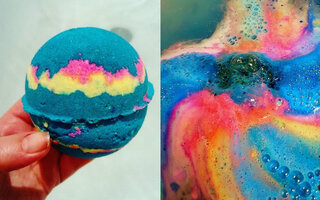 Um banho cheio de energias boas e com muitas cores espalhadas pela água, topa? As bombas são feitas para usar em banheiras e são ótimas para um momento relaxante. Aqui no Brasil dá pra comprar uma bem parecida com a da foto na Lush.
