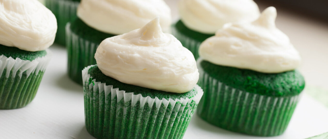 Preaqueça o forno a 180 graus. Em uma tigela, misture todos os ingredientes secos. Na batedeira, bata os ovos, o óleo, o buttermilk, o vinagre, a baunilha e, por último, o corante. Em velocidade baixa, acrescente os ingredientes secos até que tudo vire uma mistura verde e cremosa. Preencha forminhas de cupcake com a massa, leve ao forno e asse por cerca de 30 minutos.