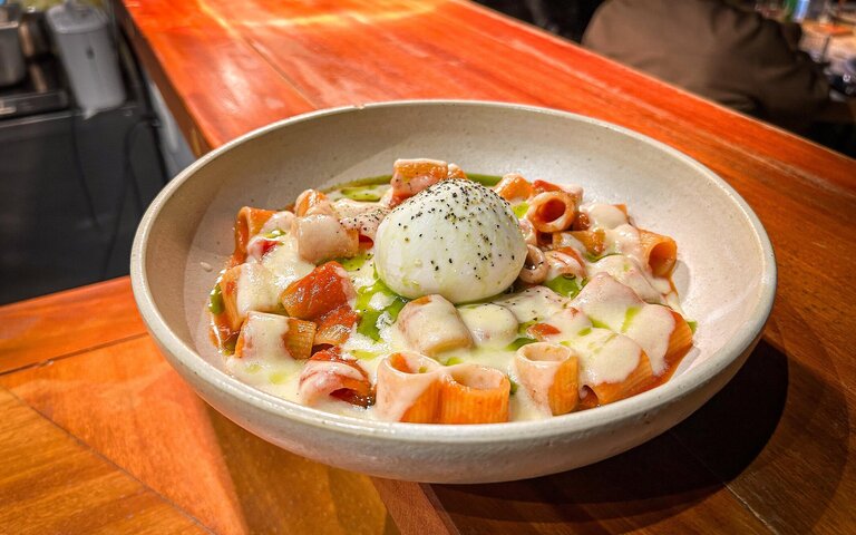 Amir Slama dá nome à Burrata de Tartare de Atum (R$ 105), com especiarias, maionese de limone e sriracha, servida com focaccia tostada e harmonizada com Mademoiselle Lili.